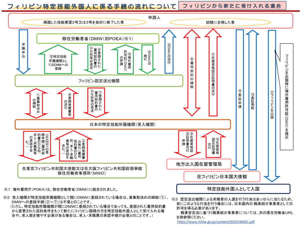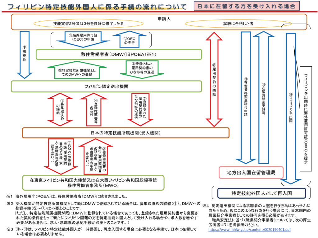 MWOMigrant Workers Office(移住労働者事務所)DMWの出先機関で日本にあります。への申請から特定技能ビザ取得、さらに日本での職場定着支援までを一貫して支援するワンストップサービスです。
